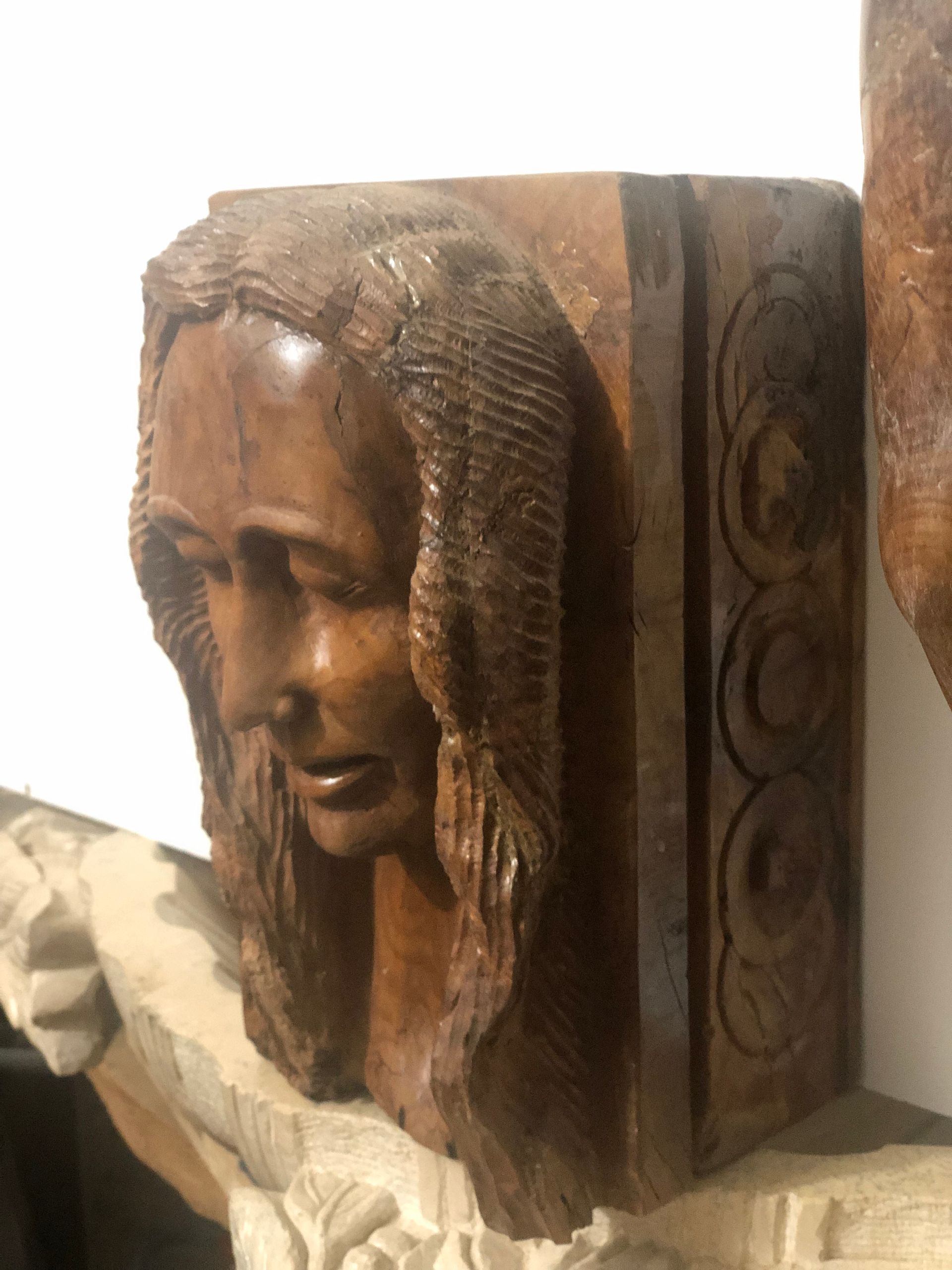 su tela con colori ad olio e da autodidatta alla scultura del legno soprattutto di ulivo, con figure astratte e di ispirazione religiosa.